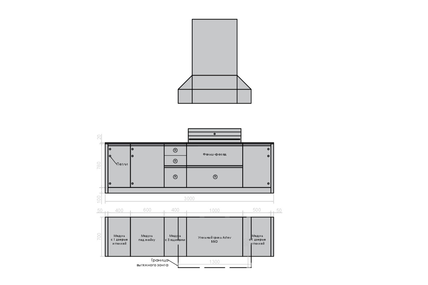 - Вытяжной зонт ш. 1300 мм, в. 1500 мм